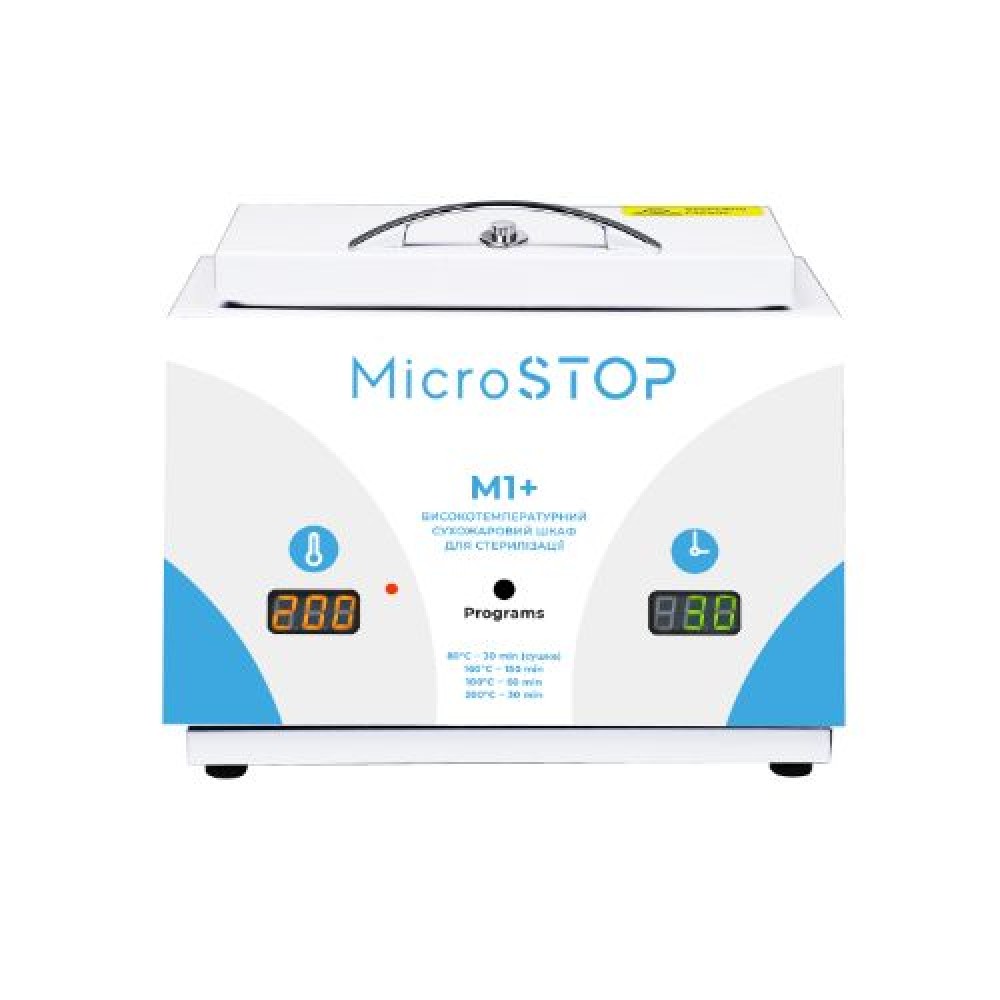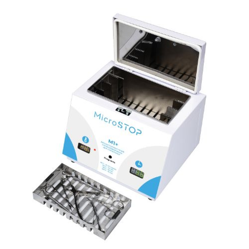 Стерилізатор Мікростоп М1+ нова універсальна сухожарова шафа, розроблена спеціально для майстрів б'юті індустрії із середнім завантаженням. У ньому одночасно можна стерилізувати 2 набори інструментів без крафт-пакетів, або 3 набори в крафт-пакетах, які розташовуються в стерилізаційній камері вертикально. При цьому розміри сухожара такі компактні, як і в його попередника М1е.