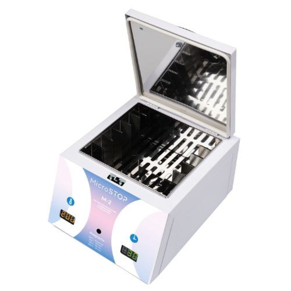 У сухожарі Мікростоп можна стерилізувати металеві та скляні інструменти, що витримують температуру 200С, які застосовуються майстрами манікюру, тату, татуажу, пірсингу, а також косметологами, подологами, бровістами. Принцип роботи приладу – стерилізація гарячим сухим повітрям.